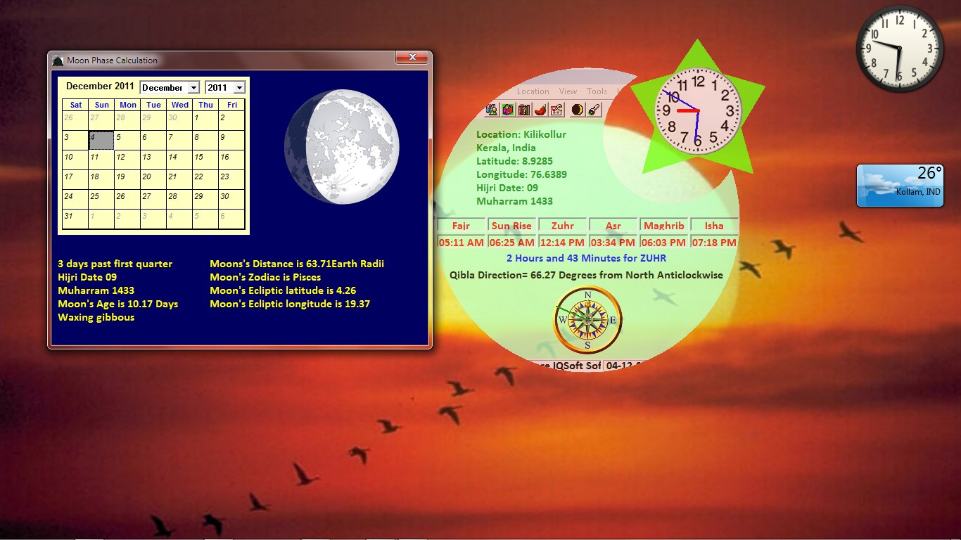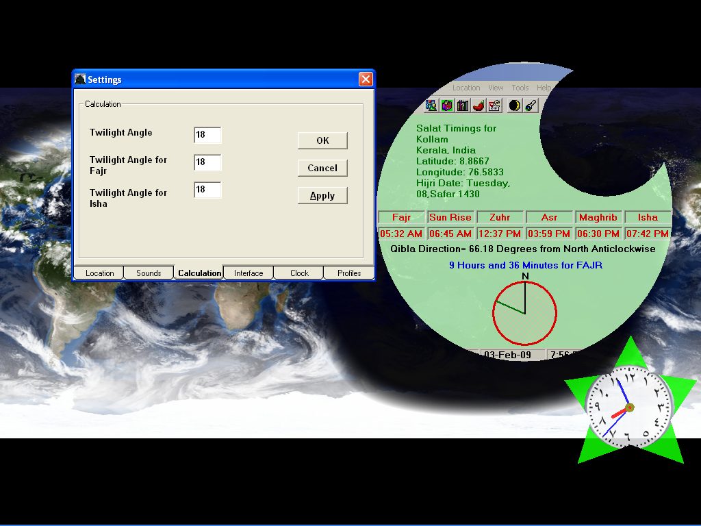 Salat calculates the prayer times for your location. If your city is not in the database (unlikely, since it has 36,000 cities in it), just feed it the latitude and longitude of your place (Get that from Google Earth) and it will calculate the times of Namaz. Options for calculating according to Hanafi and Shafe'ee schools of Jurisprudence. Other options include Height of your location (which changes the salat timing...) Now don't miss a prayer even if you are on the tip of Everest :) You can also customize your Fajr and Isha timings with a customized twilight angle...depending on the traditions at your place. Prepare customized printouts for the entire year... All this with a Jazzy interface and Adans from Medina, Mecca and more... |