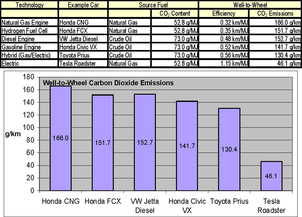 With these numbers, we can calculate the well-to-wheel emissions of the various vehicles, based on the carbon content of the source fuel and the energy efficiency of the vehicles: